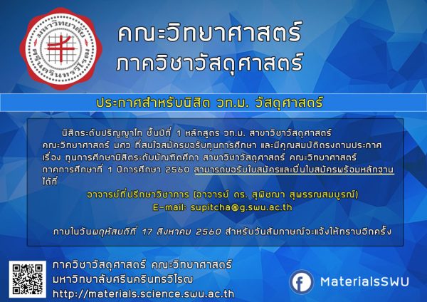 ประกาศสำหรับนิสิต วท.ม. วัสดุศาสตร์ นิสิตระดับปริญญาโท ชั้นปีที่ 1 หลักสูตร วท.ม. สาขาวิชาวัสดุศาสตร์ คณะวิทยาศาสตร์ มศว ที่สนใจสมัครขอรับทุนการศึกษา และมีคุณสมบัติตรงตามประกาศ เรื่อง ทุนการศึกษานิสิตระดับบัณฑิตศึกา สาขาวิชาวัสดุศาสตร์ คณะวิทยาศาสตร์ ภาคการศึกษาที่ 1 ปีการศึกษา 2560 สามารถขอรับใบสมัครและยื่นใบสมัครพร้อมหลักฐาน ได้ที่อาจารย์ที่ปรึกษาวิชาการ (อาจารย์ ดร. สุพิชฌา สุพรรณสมบูรณ์) E-mail: supitcha@g.swu.ac.th ภายในวันพฤหัสบดีที่ 17 สิงหาคม 2560 สำหรับวันสัมภาษณ์จะแจ้งให้ทราบอีกครั้ง ประกาศทุน ป.โท วัสดุ 1-2560
